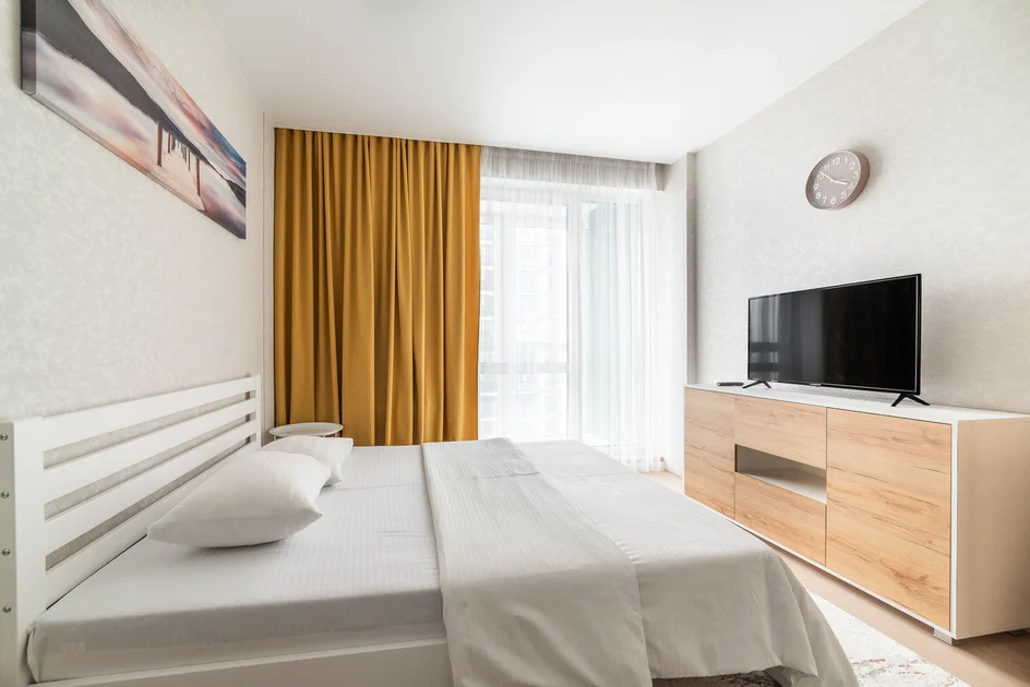 Cozy 1-bedroom apartment available for short-term rental in the Minsk-World complex at 13 Igorya Luchenka Str. It is located on the 18th floor of a 23-story building equipped with an elevator.