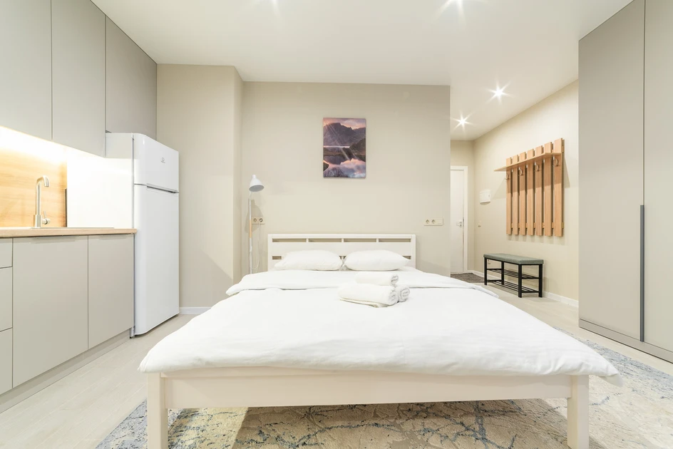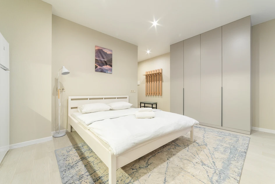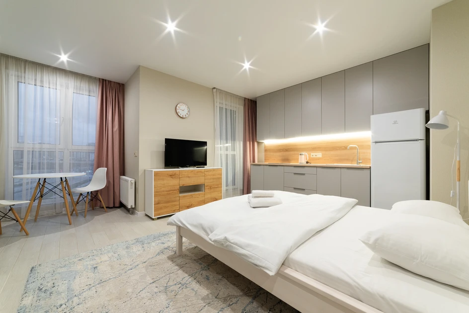 Cozy studio apartment available for short-term rental in the Minsk-World complex at 23 Igorya Luchenka Str. It is located on the 5th floor of a 10-story building equipped with an elevator.