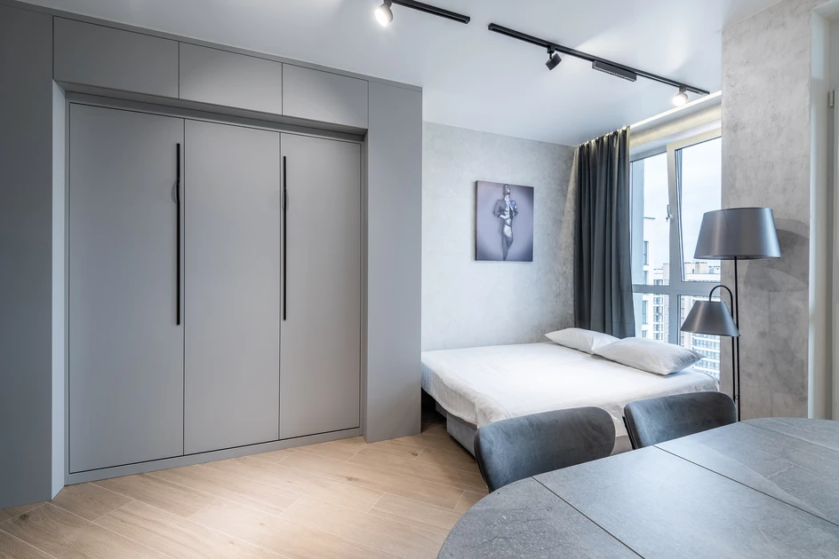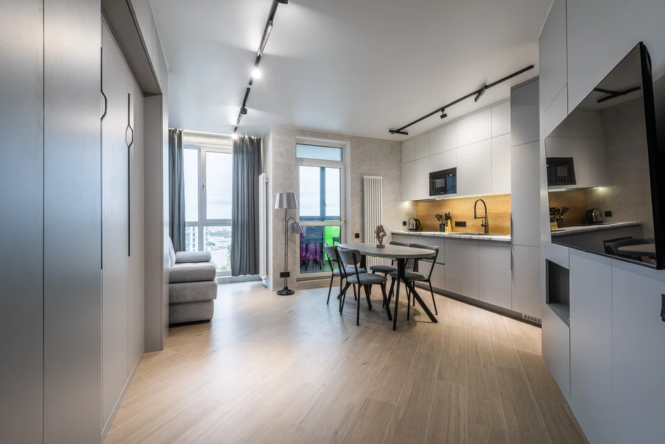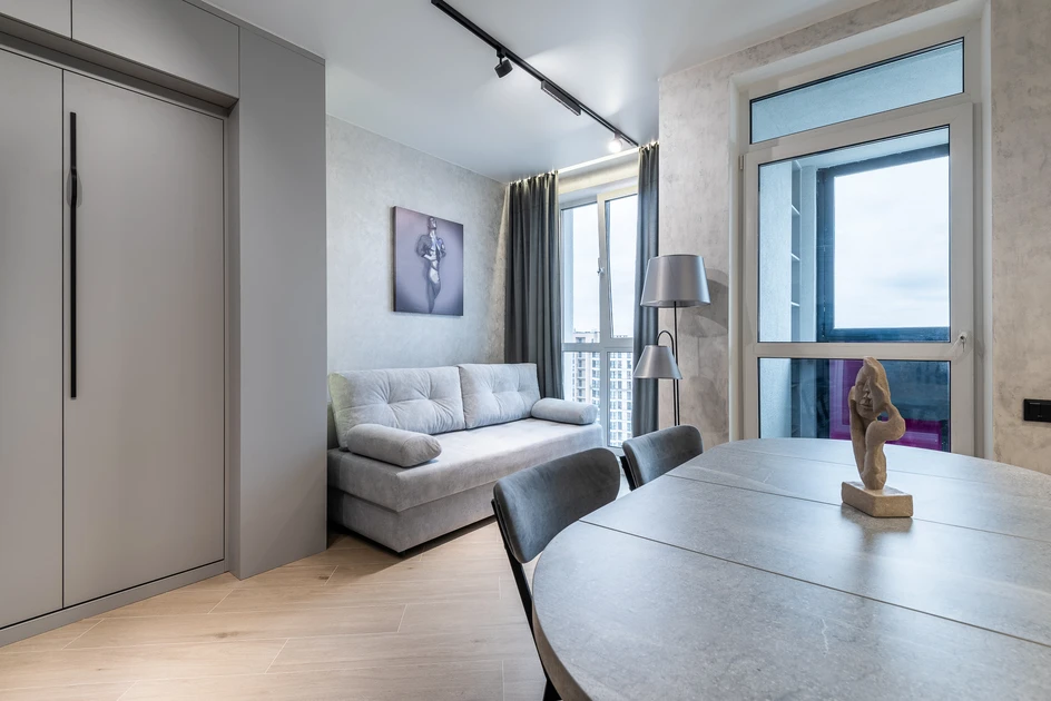 Cozy studio apartment available for short-term rental in the Minsk-World complex at 37 Mikhaila Savitskogo Str. It is located on the 24th floor of a 25-story building equipped with an elevator.